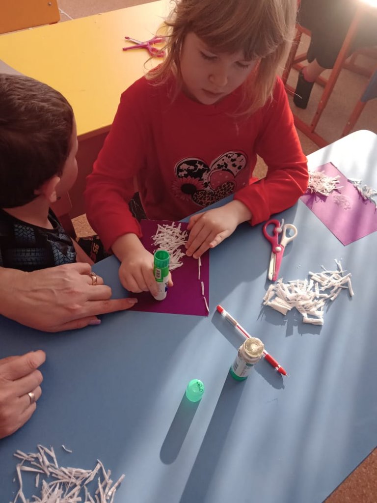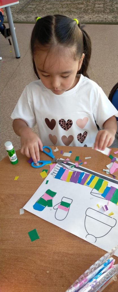 Көркемсурет студиясында балалар майлықтың кесілген жолақтарын пайдаланып, «Ақшақар» аппликациясын жасады. Ақ майлықтар жолақтарға кесіліп, негізге желімделіп, ақшақардың үш өлшемді денесін жасады.