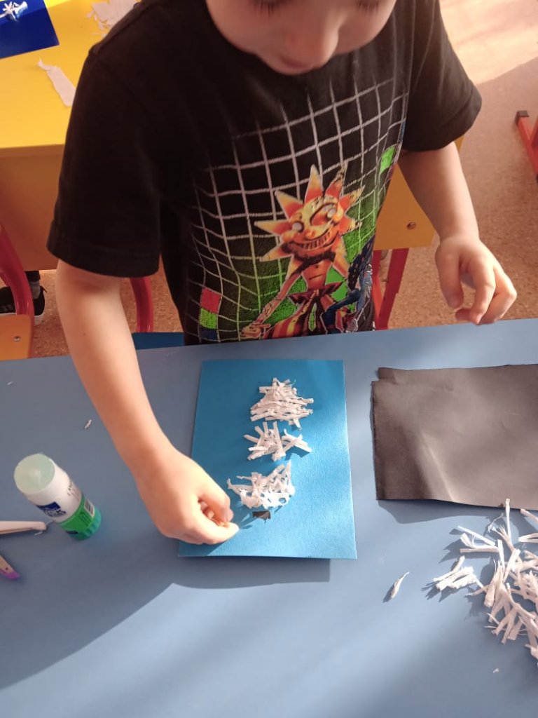 Көркемсурет студиясында балалар майлықтың кесілген жолақтарын пайдаланып, «Ақшақар» аппликациясын жасады. Ақ майлықтар жолақтарға кесіліп, негізге желімделіп, ақшақардың үш өлшемді денесін жасады.